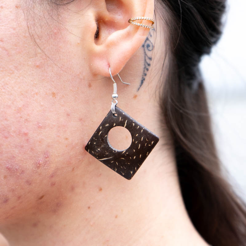 Boucles d’oreilles losange ajouré – Bijou en Bois de coco et monture en argent 925