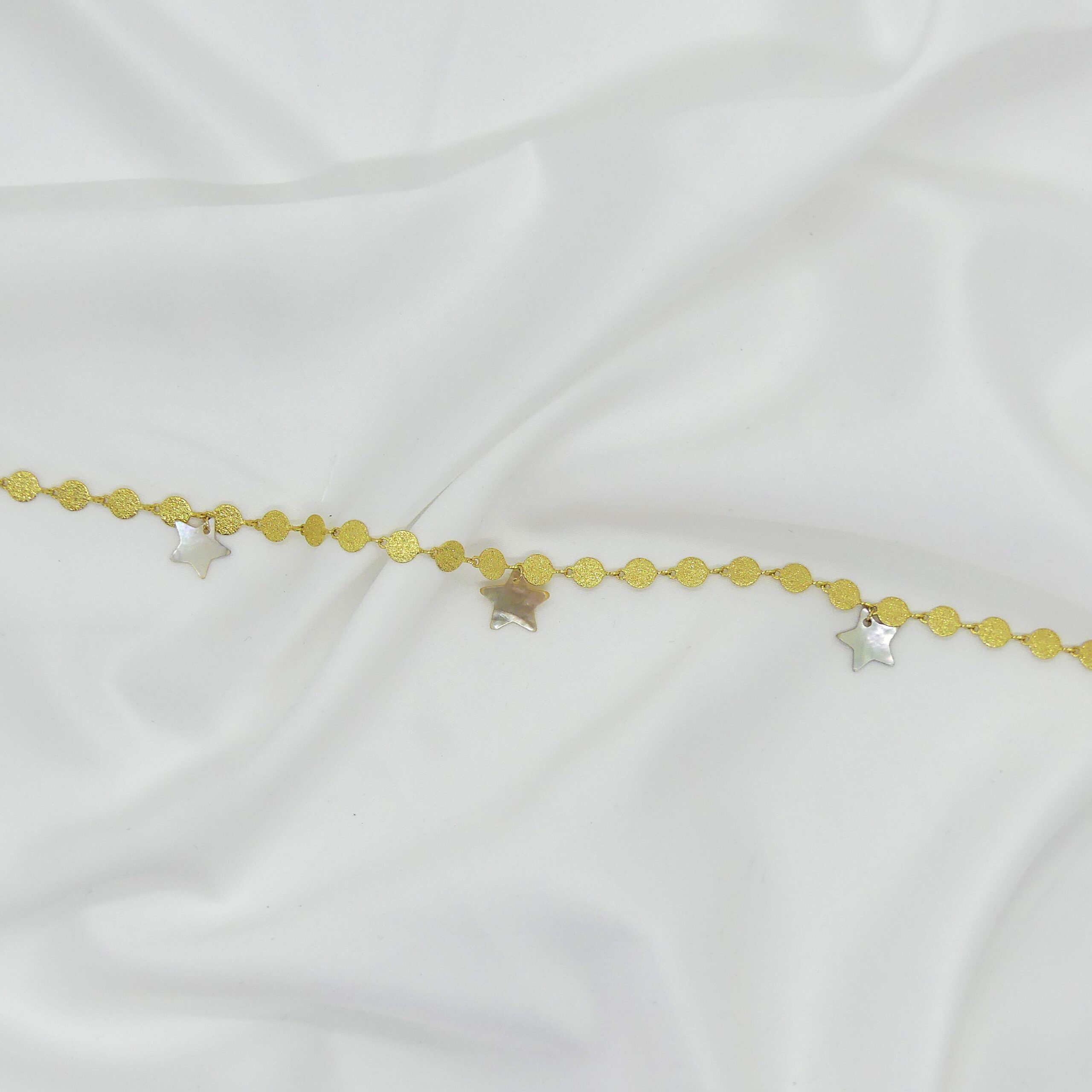 Sublimez votre style avec cette chaîne de cheville en acier inoxydable doré et ces Nacres Étoiles, parfaite pour ajouter une touche de raffinement à vos tenues. Ses maillons ronds fantaisie de 6 mm offrent une allure légère et aérienne. Trois pampilles en nacre naturelle, finement taillées en forme d’étoiles, captent et reflètent la lumière à chaque mouvement, illuminant chaque pas avec élégance.